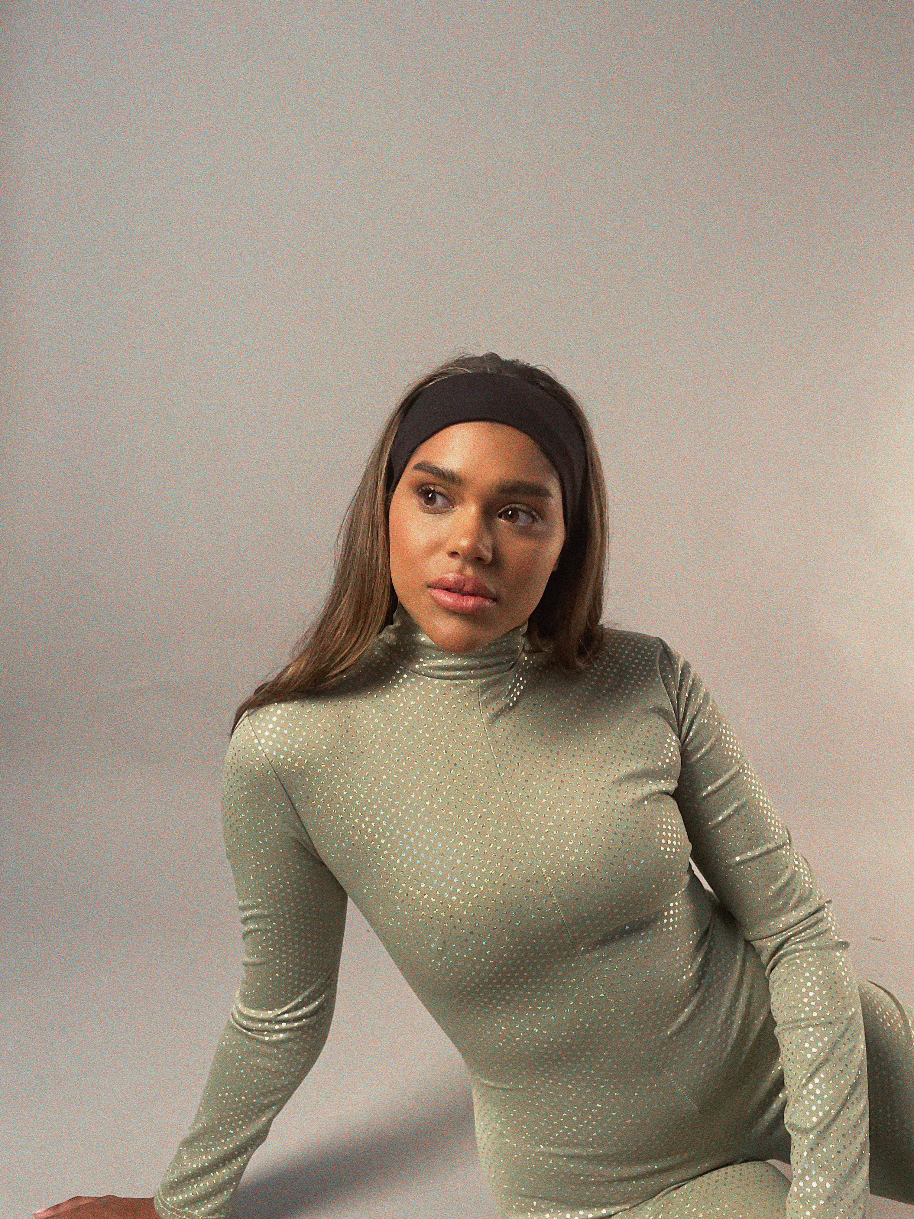 Made from jersey spandex with a hologram finish. A high neck and long sleeve design, made to stand out.